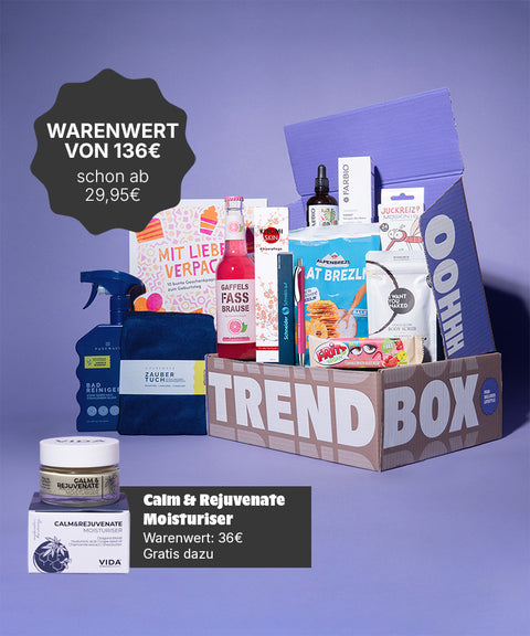 Die Trendbox ist eine monatlich erscheinende Überraschungsbox, die zu wechselnden Themen nachhaltige, bewusste und gesunde Trends enthält. Mit jeder Trendbox erhältst du 8+ ausgewählte und hochwertige Wellness- und Beauty-Trends, Food-Highlights und Drinks, sowie Lifestyle- und Design-Produkte. Deine Box hat dabei einen Warenwert von mind. 80 €.