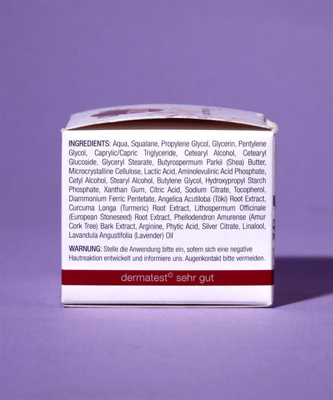 Inhaltsstoffe: Aqua, Squalane, Propylene Glycol, Glycerin, Pentylene Glycol, Caprylic/Capric Triglyceride, Cetearyl Alcohol, Cetearyl Glucoside, Glyceryl Stearate, Butyrospermum Parkii (Shea) Butter, Microcrystalline Cellulose, Lactic Acid, Aminolevulinic Acid Phosphate, Cetyl Alcohol, Stearyl Alcohol, Butylene Glycol, Hydroxypropyl Starch Phosphate, Xanthan Gum, Citric Acid, Sodium Citrate, Tocopherol, Diammonium Ferric Pentetate, Angelica Acutiloba (Töki) Root Extract, Curcuma Longa (Turmeric) Root Extract, Lithospermum Officinale (European Stoneseed) Root Extract, Phellodendron Amurense (Amur Cork Tree) Bark Extract, Arginine, Phytic Acid, Silver Citrate, Linalool, Lavandula Angustifolia (Lavender) Oil